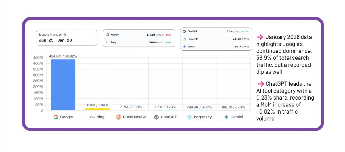 Megantic also points to broader usage patterns across AI and search platforms. It says chatgpt.com recorded 5.5 billion visits in one month, with an average session length of more than 13 minutes, while Google still held the largest share of total search traffic at 38.9% despite a dip.
