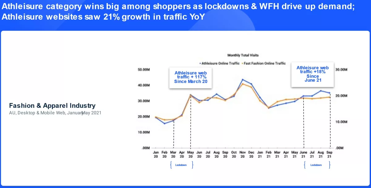 Similarweb also found that in the fashion and apparel sector, athleisure gear is becoming hugely popular. The athleisure category rapidly grew 117% during Australia's first lockdowns and 18% during Australia's second lockdowns driven by people working from home and prioritising comfort.