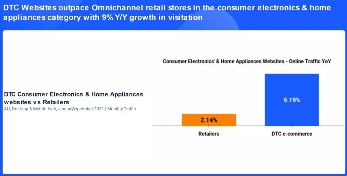 Research from Similarweb found that, in 2021, consumer adoption of DTC in the consumer electronics and home appliances category grew by 9.19%, compared with 2.14% for traditional retailers.